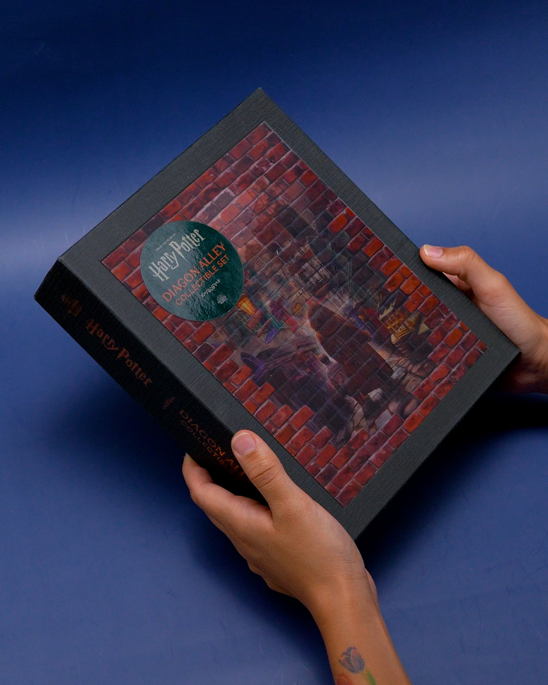 Todo viene presentado en una caja de colección rígida (20 x 25 x 6 cm) con una imagen lenticular animada de la entrada al Callejón Diagon, que al inclinarla revela a Harry, Hagrid y la icónica calle mágica.